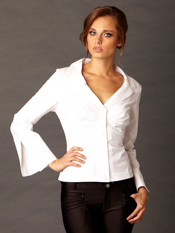 Step out of the ordinary with the fitted French Shirt. The ruched detailing around the bust paired withthe dramatic neckline adds a fresh and modern touch. Cotton/Lycra. French cuffs.