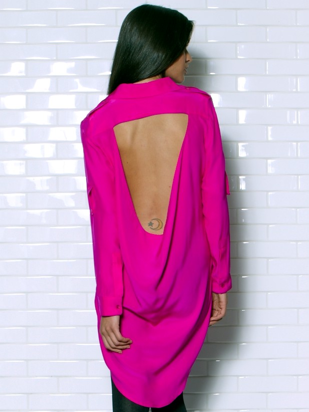 Inspire curiosity with this sexy spin on the shirtdress. Breast pockets. Button tabs at elbows. Fully Lined. Silk. By Brian Lichtenberg. USA. Available in electric pink or black.