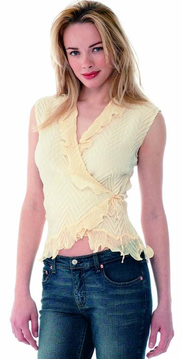 Soak in the sun in this sweet Surplice Top. Constructed with a visual “crunched” polyester that is both easy-fitting and perfect for travel. V-front has a ruffled trim that extends down around the hem. Top ties at the right inside seam, as well as the lower-left side. USA/imported. Lemon.